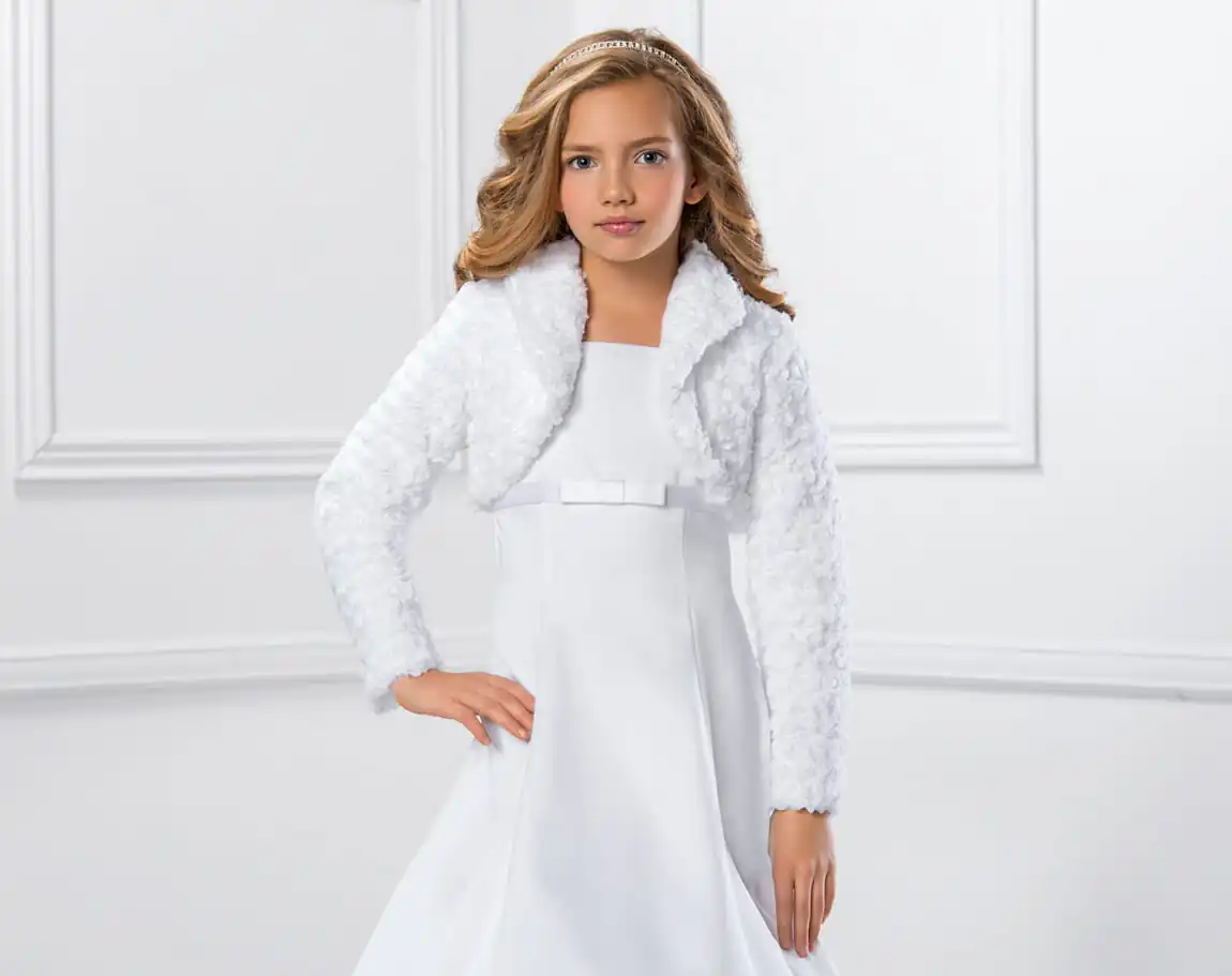 Ciepłe bolerko komunijne utrzymane w klasycznym fasonie wykonane z dzianiny futerkowej. Będzie idealnym elementem stylizacji zarówno komunijnej jak i wizytowej. Dostępne w dwóch kolorach.
